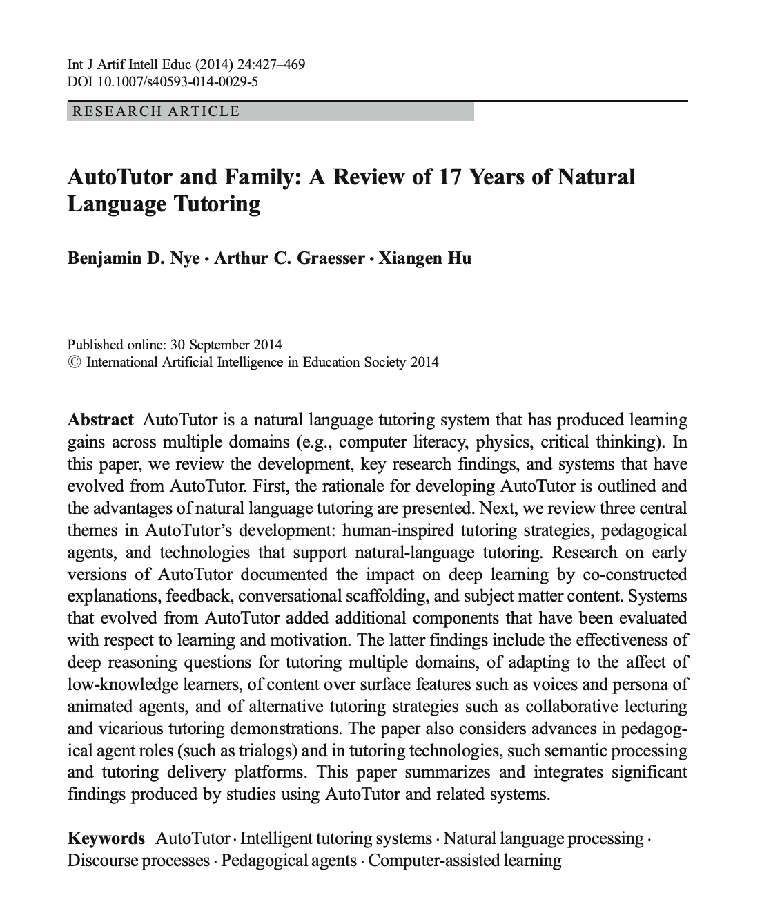 Benjamin Bloom discovered that one-on-one tutoring works in 1984. In 2014, the AutoTutor team published evidence that a natural language computer program can approximate some of what makes one-on-one tutoring work, across multiple domains, with measurable and reproducible effects.