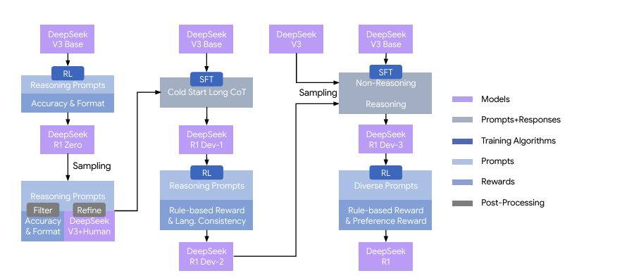 Addressing these limitations required a more conventional training pipeline, though one that preserved the reasoning capabilities discovered through pure RL. DeepSeek-R1 (the final version) underwent four stages: