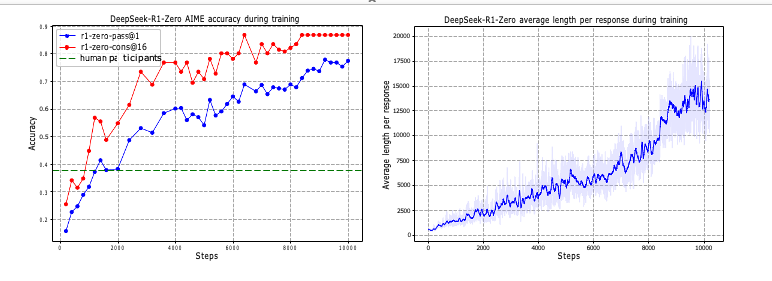Figure 1 (a) AIME accuracy of DeepSeek-R1-Zero during training. AIME takes a mathematical problem as input and a number as output, illustrated in Table 32. Pass@1 and Cons@16 are described in Supplementary D.1. The baseline is the average score achieved by human participants in the AIME competition. (b) The average response length of DeepSeek-R1-Zero on the training set during the RL process. DeepSeek-R1-Zero naturally learns to solve reasoning tasks with more thinking time. Note that a training step refers to a single policy update operation.