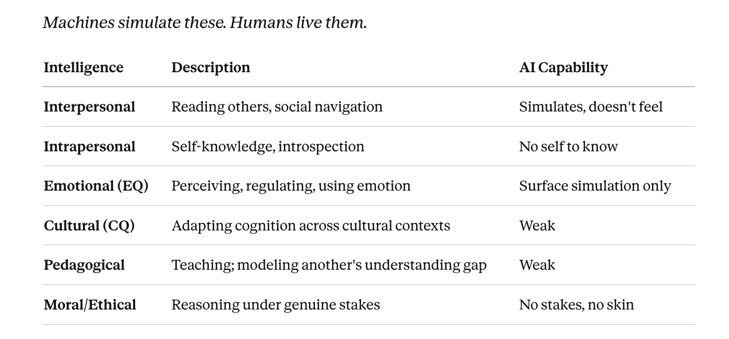 The moment has changed. Gardner’s framework was built before machines became capable. It did not need to ask which intelligences were endangered by technology, because technology — in 1983 — was not yet a serious competitor to any of them.