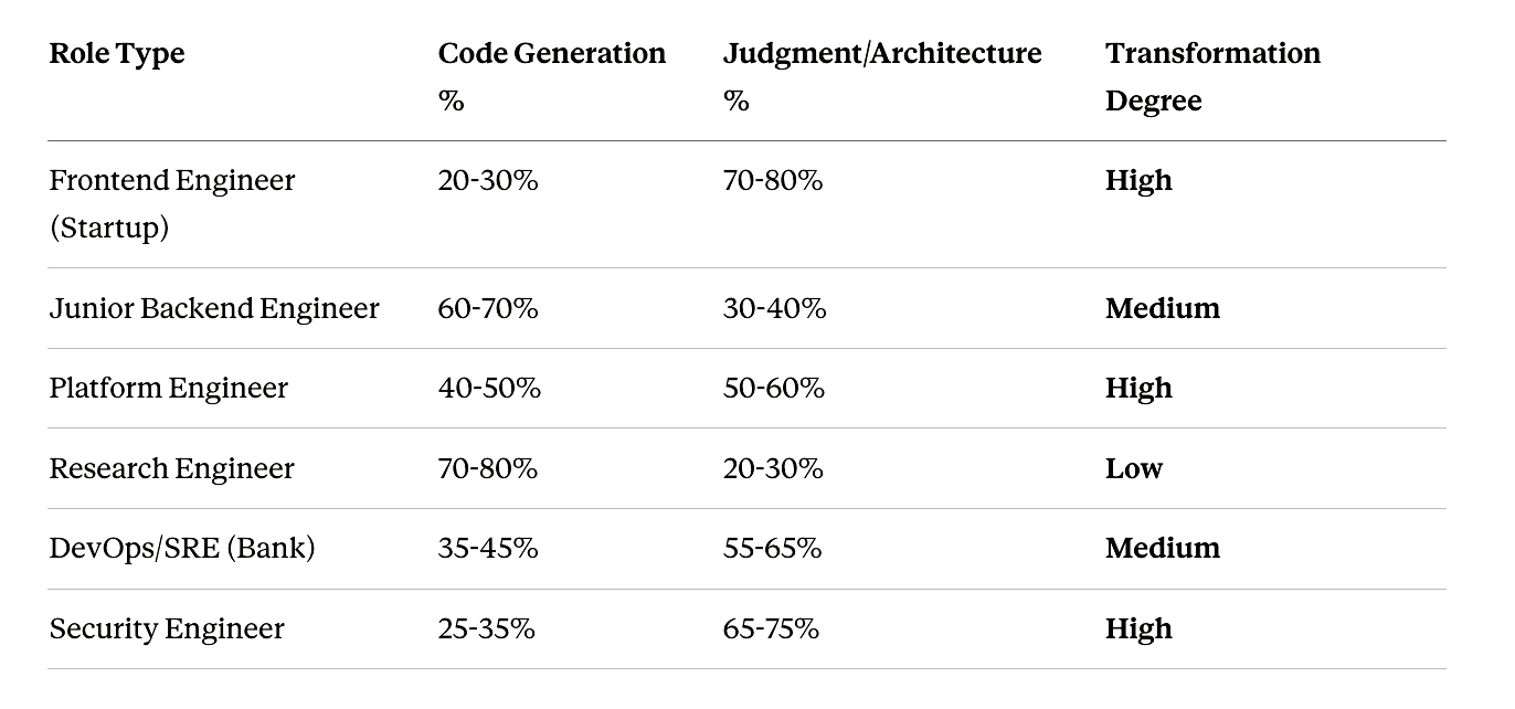 The viral narrative treats “software engineering” as a monolith. It isn’t. The transformation varies dramatically by role type, industry, and organizational context.