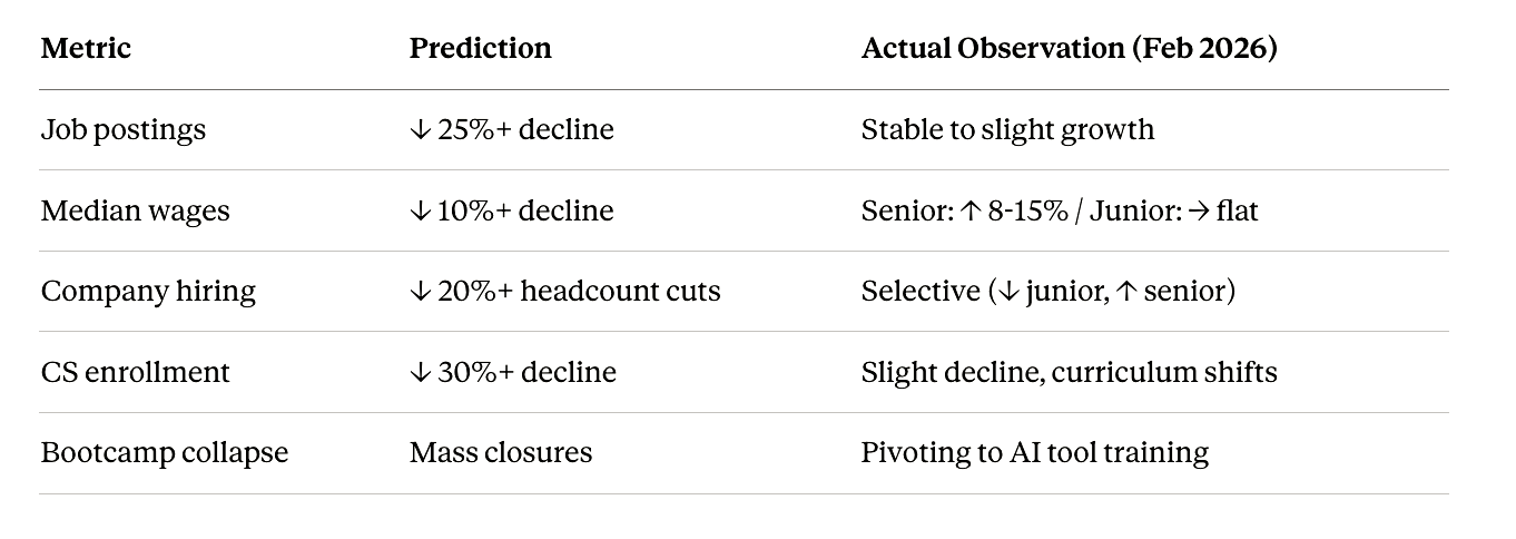 MetricPredictionActual Observation (Feb 2026)Job postings↓ 25%+ declineStable to slight growthMedian wages↓ 10%+ declineSenior: ↑ 8-15% / Junior: → flatCompany hiring↓ 20%+ headcount cutsSelective (↓ junior, ↑ senior)CS enrollment↓ 30%+ declineSlight decline, curriculum shiftsBootcamp collapseMass closuresPivoting to AI tool training