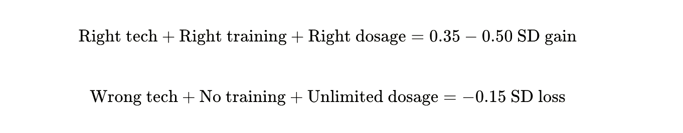 Implementation quality: The dominant variable. Same software can produce +0.35 SD or 0.00 SD depending on teacher training and usage protocols.