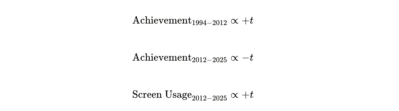 Translation: From 1994 to 2012, student achievement rose steadily across 21 nationwide benchmark tests. The peak arrived precisely when screen usage began its exponential climb—2012 to 2015. Then achievement began falling. Not slowly. Consistently. Year after year.