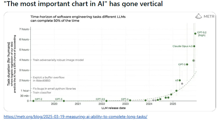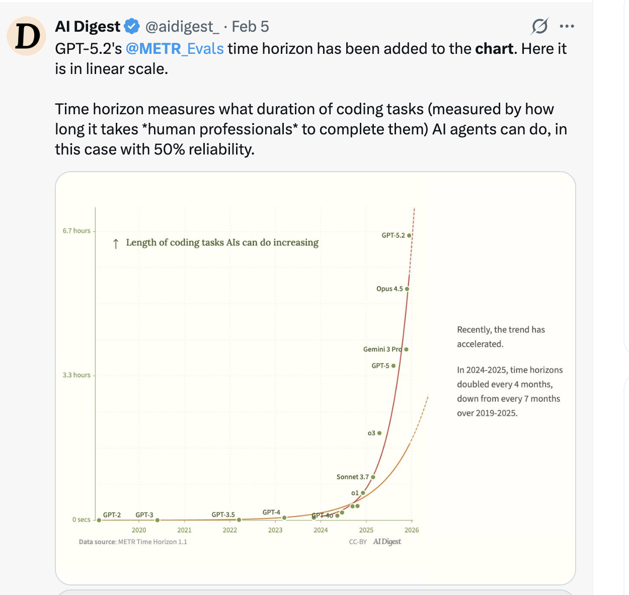 The METR (Model Evaluation & Threat Research) chart tracks “time-horizon to complete 50% of tasks”—showing AI models compressing what once took humans 7 hours into mere minutes. GPT-2 in 2020 could barely manage simple code snippets. Claude Opus 4.5 in 2026 can architect entire systems. The vertical ascent suggests we’re witnessing the obsolescence of a profession in real time.
