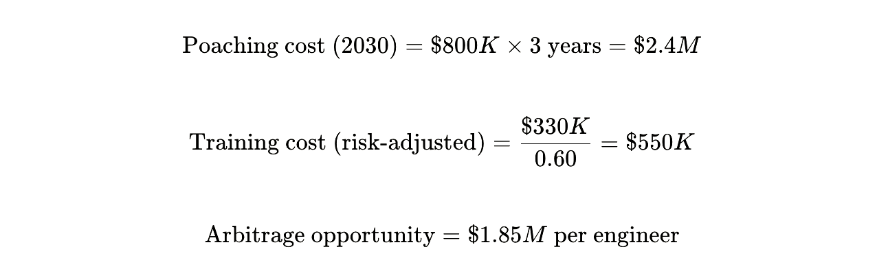 The math is brutal. If junior hiring stays suppressed 20% below 2022 levels through 2026, and normal senior attrition continues at 10% annually, by 2031 the available pool of experienced engineers will have contracted by approximately 70% just as demand remains stable or grows. Companies will bid $600,000, then $800,000, then discover that no salary can purchase expertise that doesn’t exist.