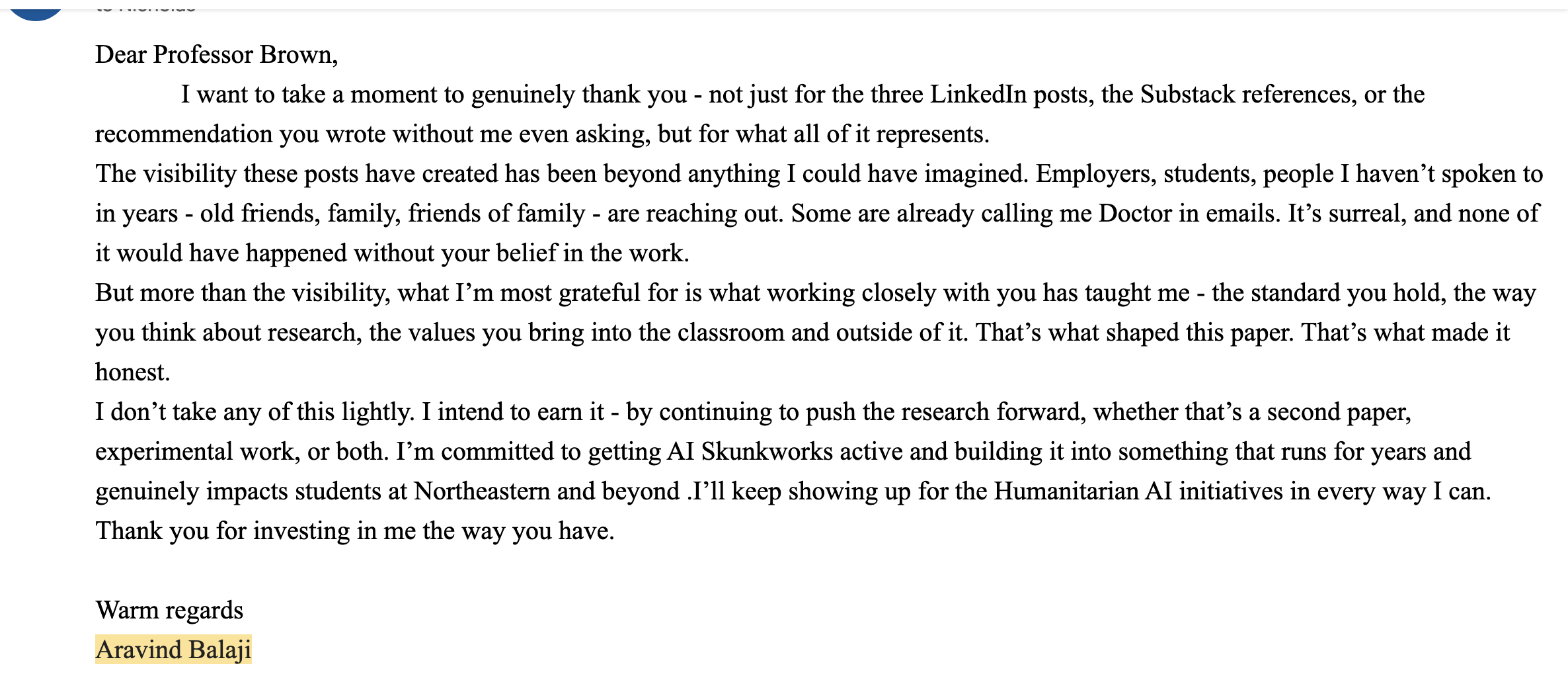 Aravind thanks me for the LinkedIn posts, the Substack references, the recommendation I wrote without being asked. These are the things that generated the visible consequence — the employers, the friends writing back, the Doctor in the subject line.