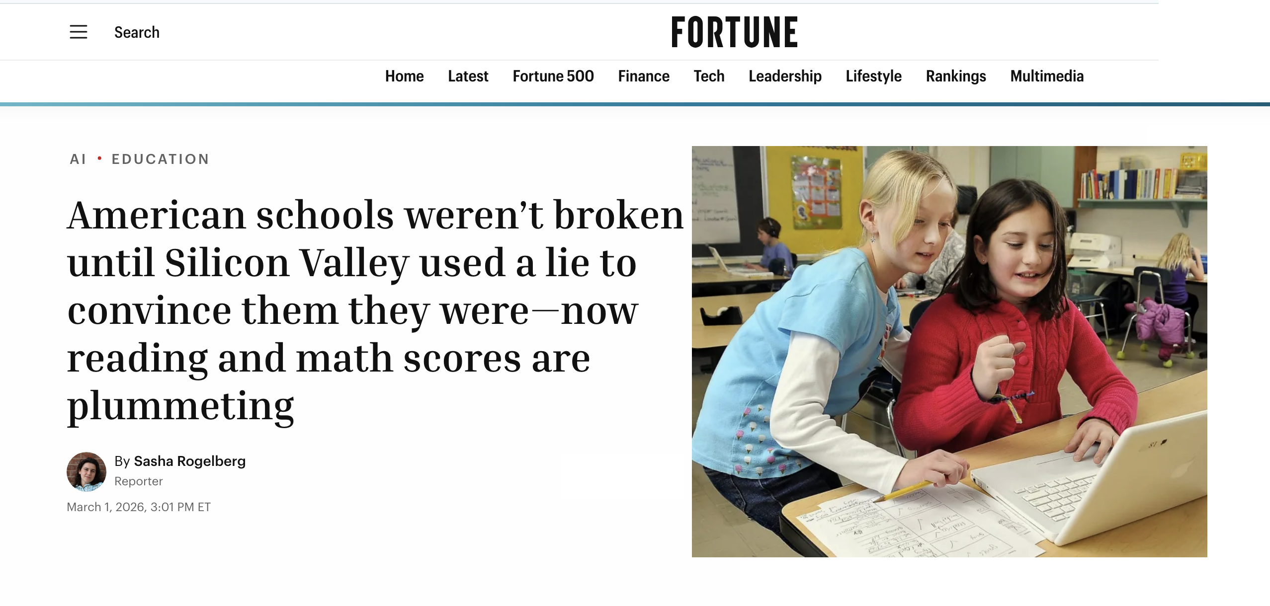 The article under review: Sasha Rogelberg, “American schools weren’t broken until Silicon Valley used a lie to convince them they were—now reading and math scores are plummeting”, Fortune, March 1, 2026.
